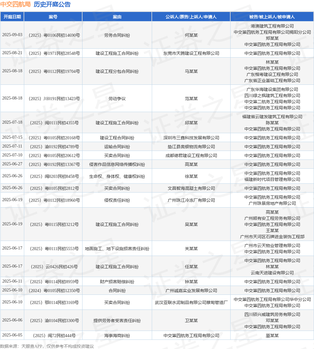 案号:(2025)闽0203民初8458号审理法院:厦门市思明区人民法院案由:生命权、身体权、健康权纠纷当事人信息: 原告/上诉人:徐某某 被告/被上诉人:中交第四航务工程局有限公司、福建新时代项目管理有限公司开庭日期:2025年6月26日根据统计,近一年内以中交第四航务工程局有限公司为当事人的历史开庭公告有166则,其中案由为“建设工程施工合同纠纷”的公告以35则居首,其次为“买卖合同纠纷”有31则,“劳务合同纠纷”有14则。历史开庭公告(前20条)如下: