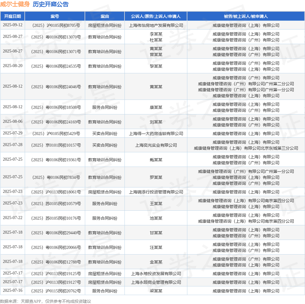 案号:(2025)沪0105民初633号审理法院:上海市长宁区法院案由:装饰装修合同纠纷当事人信息: 原告/上诉人:上海万星建设工程有限公司 被告/被上诉人:威康健身管理咨询(上海)有限公司开庭日期:2025年6月17日根据统计,近一年内以威康健身管理咨询(上海)有限公司为当事人的历史开庭公告有1836则,其中案由为“服务合同纠纷”的公告以1654则居首,其次为“教育培训合同纠纷”有37则,“房屋租赁合同纠纷”有23则。历史开庭公告(前20条)如下: