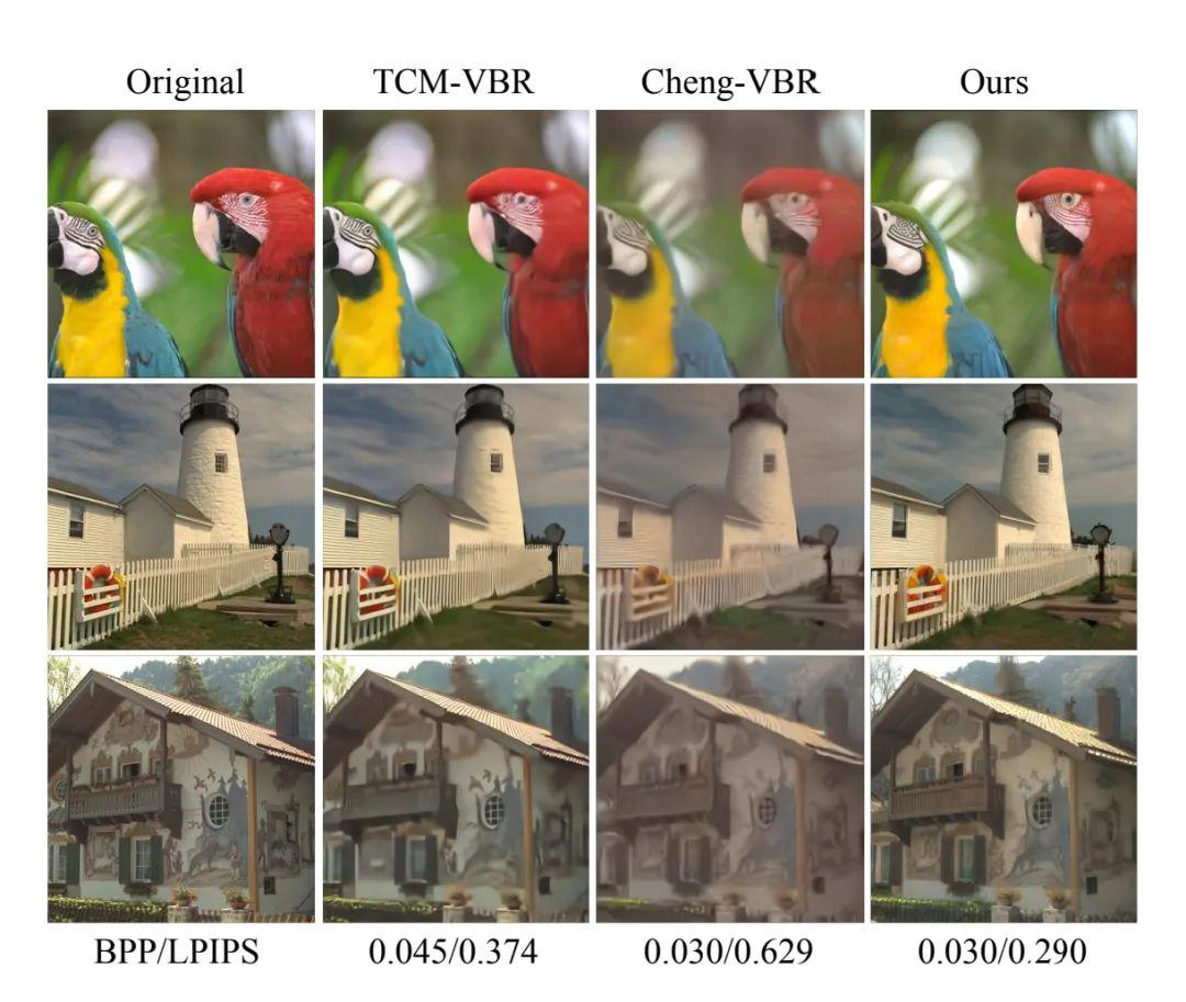 实验数据显示,在0.01~0.2比特/像素下,常建慧的方法比国际最新的H.266/VVC标准,能节省高达79%的码率。在论文的定性对比中,当VVC的画面已经出现明显块效应、其他先进算法的画面变得模糊时,根据常建慧论文中的方法重建出的图像依然纹理清晰、细节锐利,无论是人物的皮肤纹理还是风景的枝叶脉络,都实现了高度逼真的还原。
